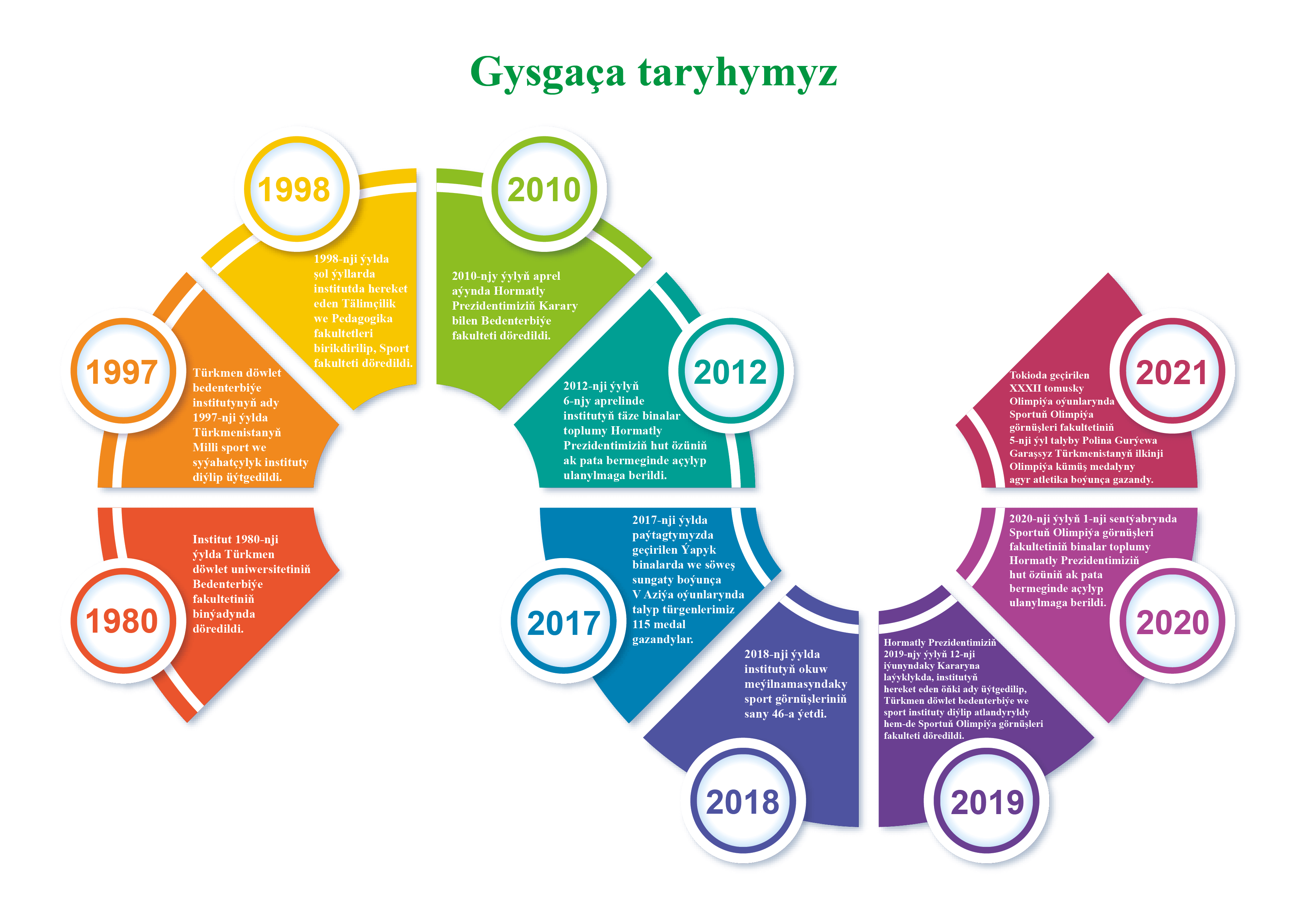 1980-nji ýylda Türkmen döwlet uniwersitetiniň Bedenterbiýe fakultetiniň binýadynda döredilen Türkmen döwlet bedenterbiýe institutynyň ady 1997-nji ýylda Türkmenistanyň Milli sport we syýahatçylyk instituty diýlip üýtgedildi. Hormatly Prezidentimiziň 2019-njy ýylyň 12-nji iýunynda kabul eden Kararyna laýyklykda, ýurdumyzyň bedenterbiýe we sport ulgamy üçin ýokary derejeli hünärmenleriň taýýarlygyny kämilleşdirmek maksady bilen institutyň hereket eden öňki ady üýtgedilip, ol Türkmen döwlet bedenterbiýe we sport instituty diýlip atlandyryldy.